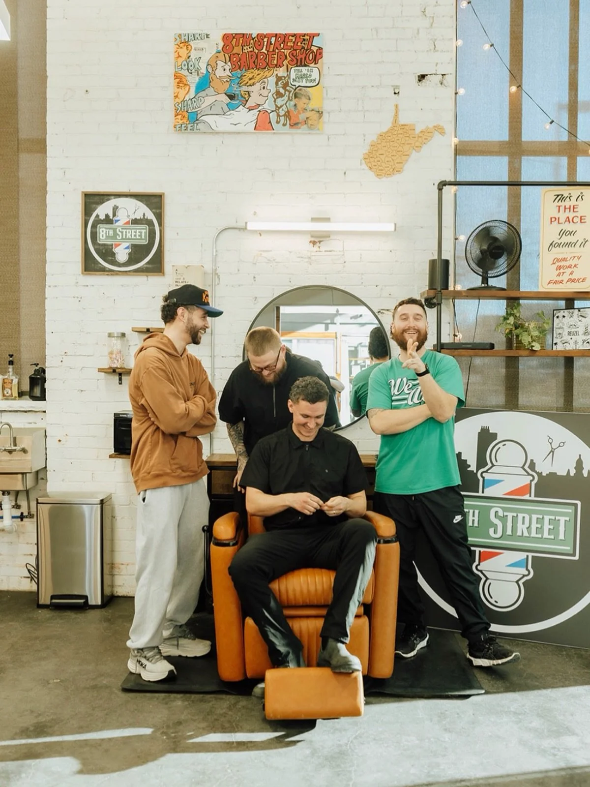 Located in downtown Huntington, 8th Street Barbershop is home to five master barbers: Jordan Walker (owner), Seth Bratchett, Arrick Montgomery, and Jalen Pennington. For the past nine years, we have proudly served the Huntington community. At 8th Street Barbershop, we take pride in offering fast, efficient service without compromising on quality, ensuring results that exceed our clients' expectations. Walk-ins are solely by chance; appointments are guaranteed. Book online with your preferred barber below or call the shop.